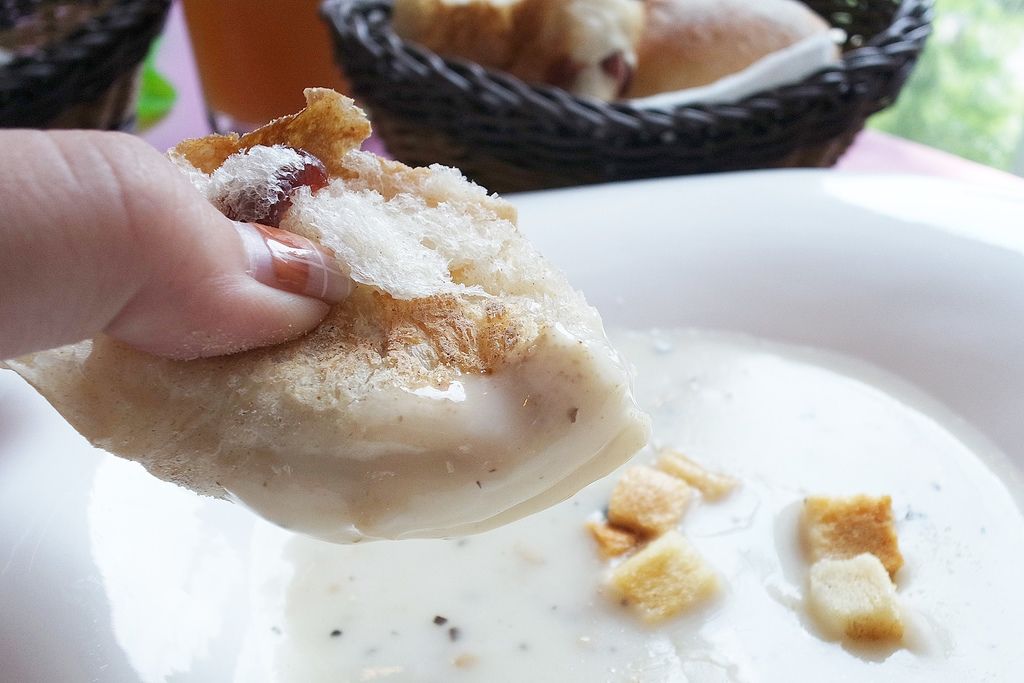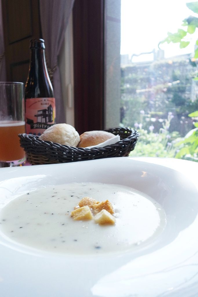 它們濃湯喝起來非常濃郁,居然也是使用法式烘焙的麵包熬煮,在搭配樓下的當日限定法式麵包更是別有風味,小布丁也乖乖坐著吃麵包。