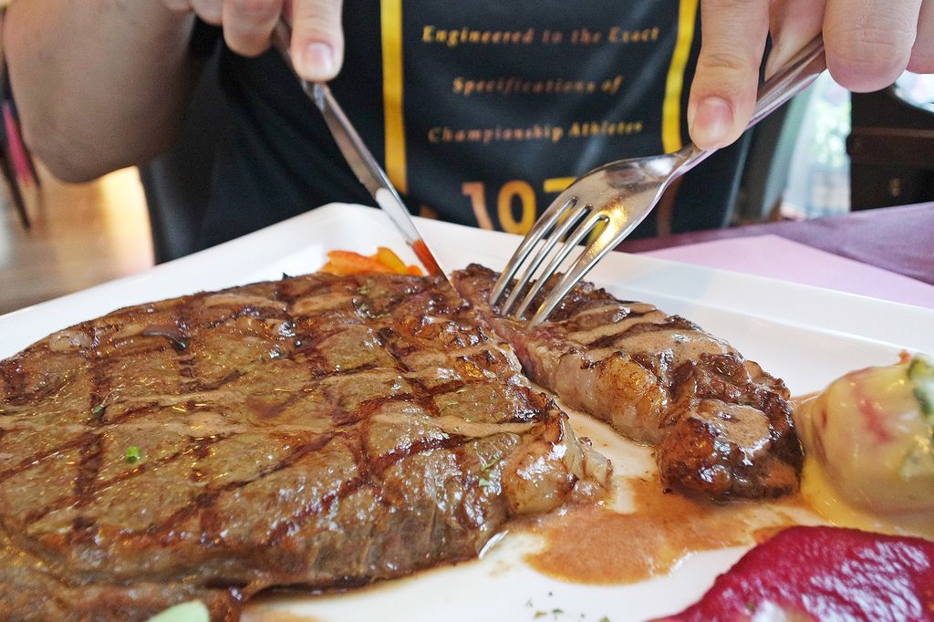 密蘇里炙烤肋眼牛佐蒜香奶油一上菜,就覺得份量十足,馬上征服你的目光,主廚特選肋眼牛排非常厚實又很大塊,Q彈軟嫩的肉質迸發鮮香肉汁,牛肉完美的原汁原味讓人感受純粹自然的感動,而且還搭配許多生鮮蔬果,吃起來更加爽口。